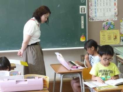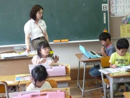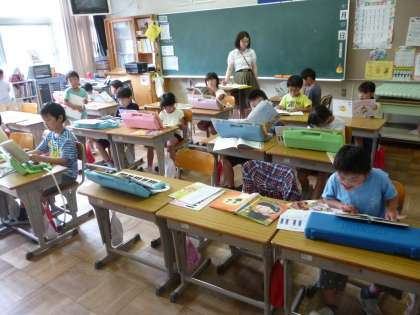 2年生が、鍵盤ハーモニカを弾いて、先生に聞いてもらっています。