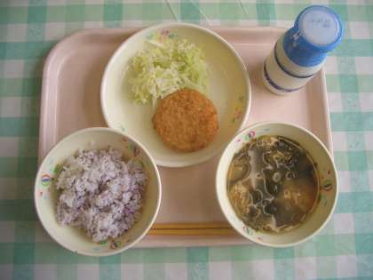 今日は、みそ汁になすが入っています。なすは、夏野菜で、体を冷やしたり、塩分を体外に出したりするはたらきがあります。特になすの紫色の部分は、体のはたらきを助ける効果があるそうです。