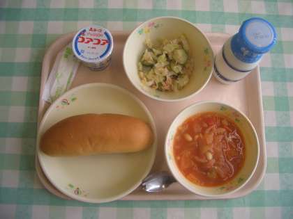 白インゲン豆のトマト煮に入っているジャガイモは、学校の畑でたけのこ学級が栽培しました。形も大きさもちょうど良く、おいしいジャガイモに育ちました。