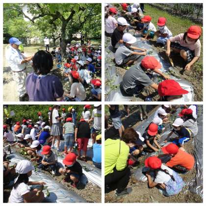 協力班ごとに分かれて、サツマイモの苗植えを、池野タイムに短時間で行いました。梅雨の雨間の暑い中、皆一生懸命活動できました。秋にサツマイモが、いっぱい収穫できるといいですね。