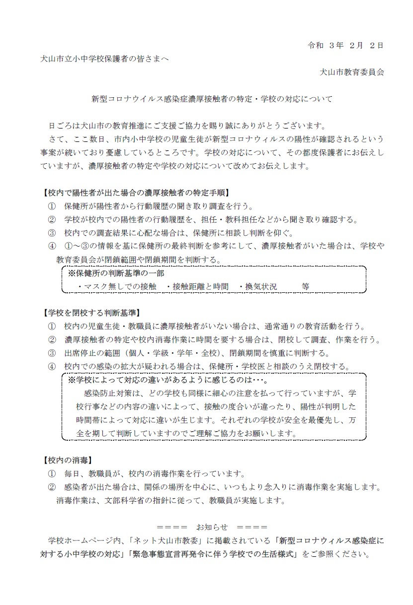 2月3日 犬山市教育委員会からのお知らせ