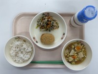 今日は新しいクラスでの初めての給食でした。お赤飯は、1年生の入学と、2年生から6年生の進級お祝いのためです。