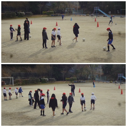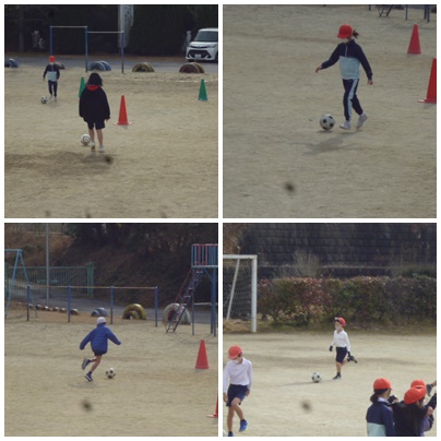 写真は、サッカーボールでのリレーのような活動です。ひとりずつコーンを回ってきます。