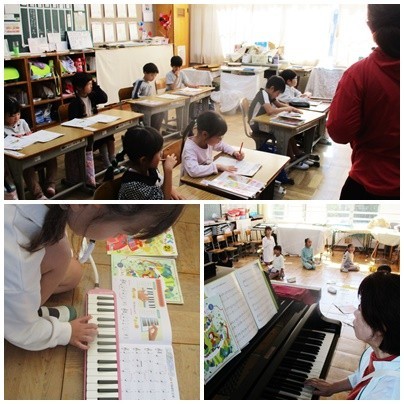 1年生の算数では、くり上がりの計算練習に取り組んでいます。プリントを活用して、くり返し行ってます。2年生の音楽では、夕やけ小やけの合唱やけんばんハーモニカの練習を行いました。