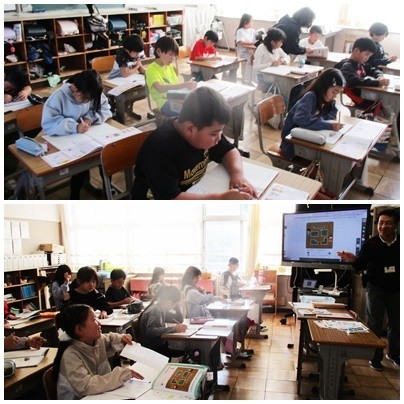4年生は算数の授業で、図を使って高さを求める問題に取り組んでいます。5年生は算数の演習問題に取り組みました。分からない問題は、先生に解き方を聞いて確認しています。6年生は社会科の授業で、江戸時代について学びを深めました。