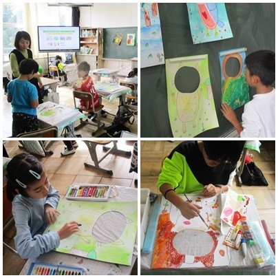 3年生は、図工で「顔を出したらなんだかワクワク」という作品が完成しました。どんな顔になるのか想像しながら、楽しそうに取り組んでいました。
