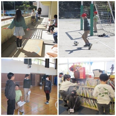 池野タイムは天気に恵まれ、運動場で元気いっぱいに体を動かしていました。体育館では、明日の6年生を送る会に向けて、リハーサルを行っていました。図書館では、たくさんの子が本を借りたり、読書をしたりして思い思いに過ごしていました。