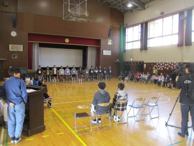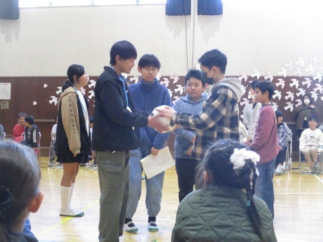 4年生は池野小学校クイズと歌、5年生は思い出ムービーと手話での歌です。6年生からはみなさんへ、卒業式で歌う「旅立ちの日に」の贈り物です。途中、涙ぐむみんなの顔がちらほら見られる場面もありました。全校で「ありがとうの歌」を合唱し、最後は6年生に向けてお礼の言葉を伝える時間を持ちました。