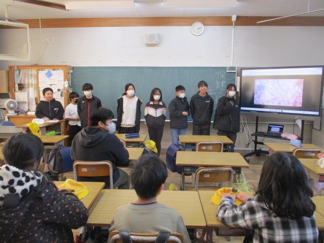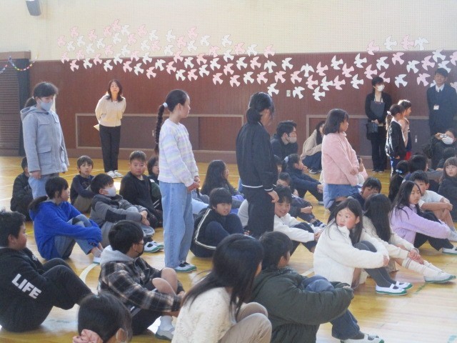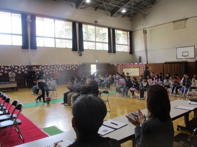 4年生は池野小学校クイズと歌、5年生は思い出ムービーと手話での歌です。6年生からはみなさんへ、卒業式で歌う「旅立ちの日に」の贈り物です。途中、涙ぐむみんなの顔がちらほら見られる場面もありました。全校で「ありがとうの歌」を合唱し、最後は6年生に向けてお礼の言葉を伝える時間を持ちました。