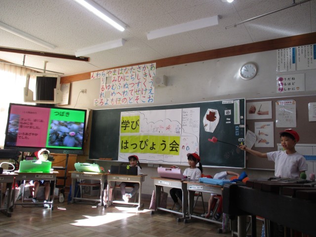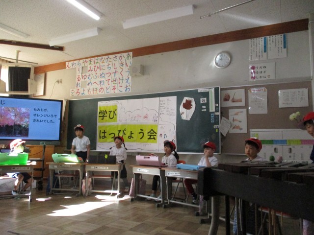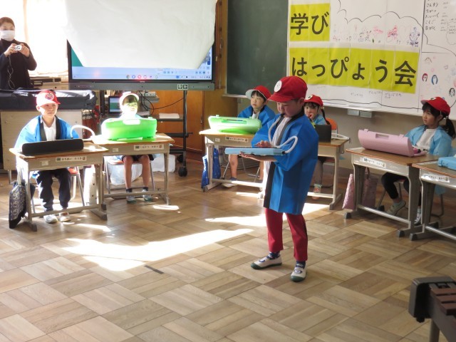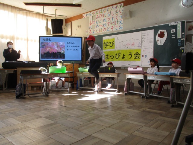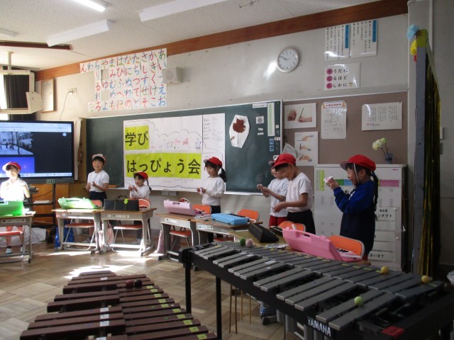 けんばんハーモニカの合奏や、なわとび・マット運動、計算カードの取組、生活科で調べたことをスライドにまとめたことを発表しました。一生懸命取り組む子どもたちの姿に、保護者の皆様から温かい拍手が送られました。