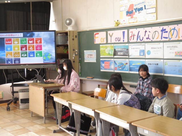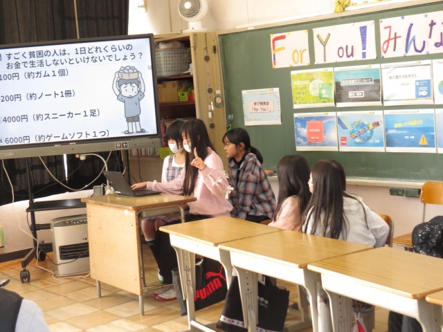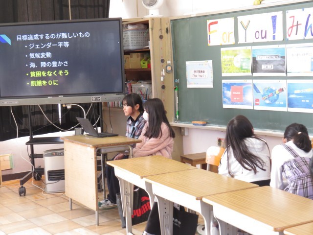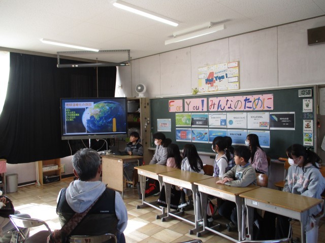 社会科や総合的な学習の時間で学んだことをもとに、児童一人一人がテーマを決め、調べた内容をスライドにまとめて発表しました。SDGsや地球温暖化、ゴミ問題、自然環境など、身近な課題について自分の考えを交えて伝えることができました。