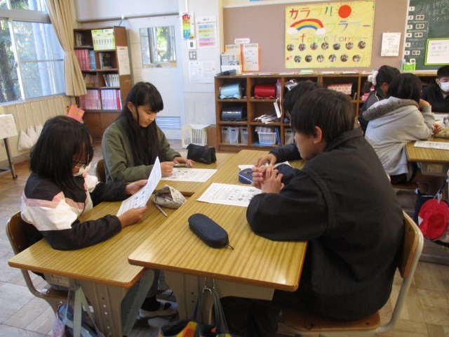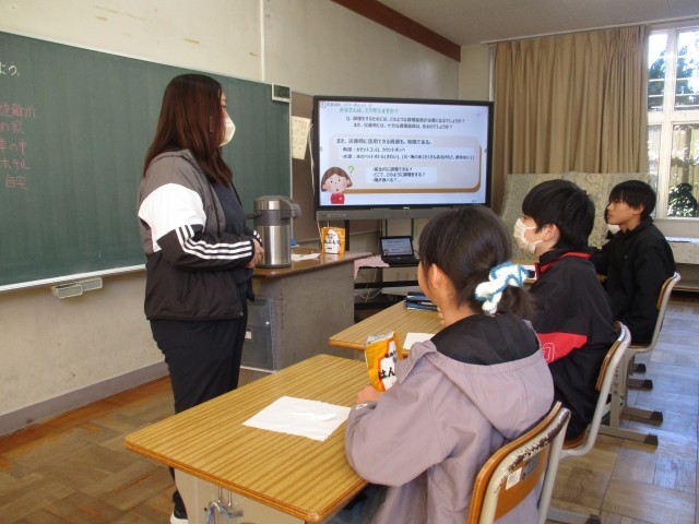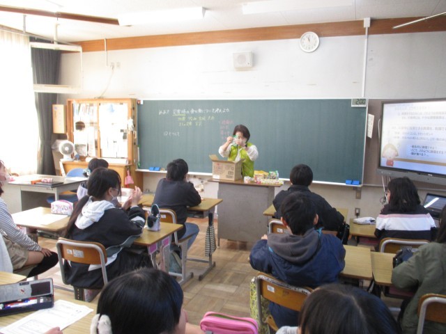 今日の家庭科は栄養職員の野内先生を招いて「池野小学校の給食の献立はどのようなことを考えて作られているだろうか」について学びました。「成長期のみんなさんのことを考えて、赤、黄、緑の食材をバランス良く使い、栄養のことを一番大切に考えています。また、旬の食材をなるべく多く取り入れ、予算のことにも気をつかいます。」というお話がありました。さあ、みなさんも実際に給食の献立を立てることができるでしょうか。