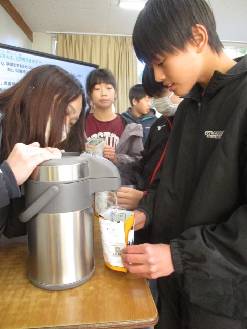 また、授業の後半には、個包装になったアルファ化米を自分たちで調理する経験をし、そのご飯を今日の給食時に食べました。
