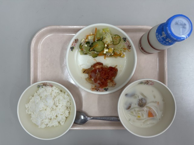 ・ごはん ・牛乳 ・鶏肉のトマト煮込み ・チーズ入りコールスロー ・ミルクスープ