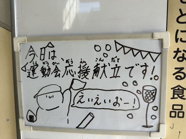 赤組応援として、赤色のトマトを使用した、鶏肉のトマト煮込みを、白組応援として、白色の牛乳を使用した、ミルクスープを出しました。