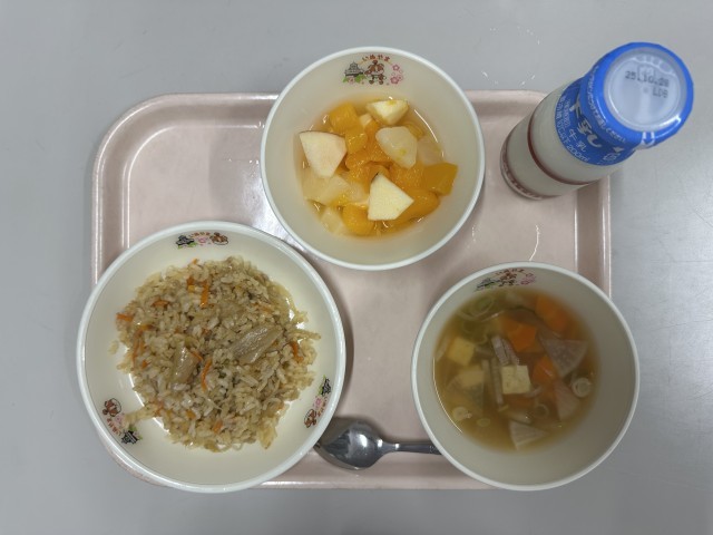 ・キムたくチャーハン ・牛乳 ・豆腐のスープ ・フルーツポンチ