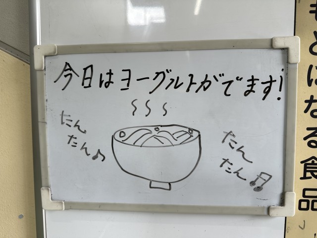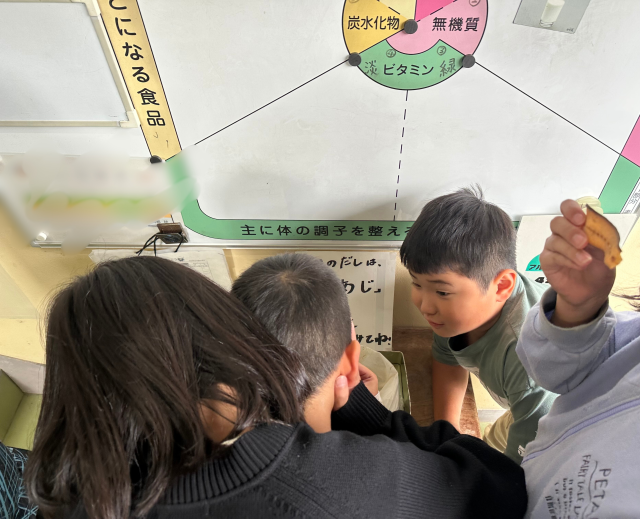 栄養黒板前に今日使用した、だしが置いてあり、見にきて、匂いを嗅いでみたり、「これ、ご飯にかけたらおいしそうだね!」とお話ししてくれる子もいました。