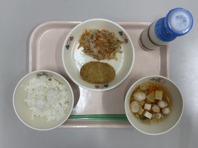 給食 【今日の献立】 ・ごはん ・牛乳 ・里いもコロッケ ・白菜とちくわのしょうが和え ・お月見汁 ・お月見デザート 【栄養士より】 今日は、十五夜献立です。 給食だよりにも載せましたが、お月見は、美しい月を見ながら、野菜などの作物が収穫されたことに感謝する行事です。 芋の収穫時期でもあるため、「芋名月」とも呼ばれています。そのため、今日の献立にも、里いもコロッケが出ています。 今夜は、月があまり見えない予報となっていますが、給食を食べて、お月見気分を味わいましょう。