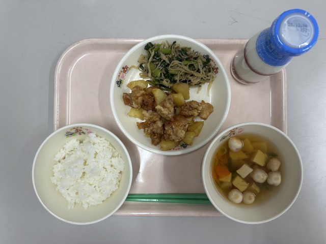 【今日の献立】・ごはん ・牛乳 ・鶏肉とじゃがいもの揚げ煮 ・小松菜と切り干し大根の和え物 ・ふだま汁