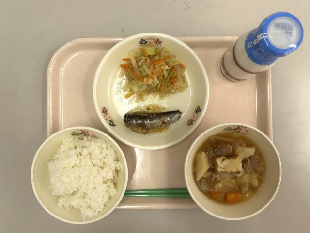【今日の献立】・ごはん ・牛乳 ・いわしの生姜煮 ・キャベツのごま和え ・肉じゃが