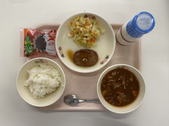 【今日の献立】・ごはん ・牛乳 ・照り焼きハンバーグ ・ポークシチュー ・チーズ入りサラダ ・クリスマスデザート