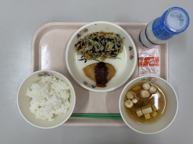 ・ごはん ・牛乳 ・味噌カツ ・野菜のごま酢和え ・ふだま汁 ・ミルメークコーヒー