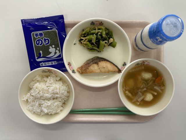 ・麦ごはん ・牛乳 ・セルフおにぎりののり ・鮭の塩焼き ・小松菜のたくあん和え ・すいとん汁