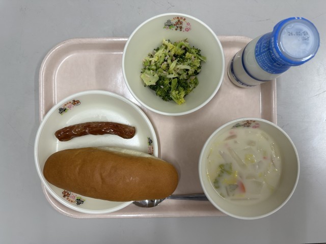 ・ロールパン ・牛乳 ・里いもとかぶのシチュー ・焼きフランクフルト ・ブロッコリーのフレンチドレッシングサラダ