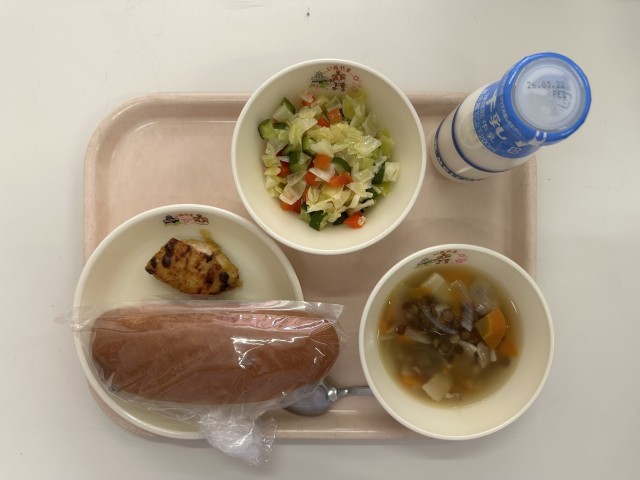 【今日の献立】・ロールパン ・牛乳 ・ケバブ風チキン ・チョバンサラタス ・レンズ豆のスープ