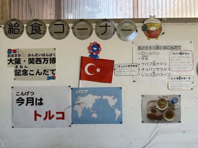 【栄養士より】今日は、今年度最後の大阪・関西万博記念献立です。この一年間を通して様々な国の料理を紹介してきました。今日は、世界三大料理の一つ、トルコ料理が登場しています。中でも、ケバブは、トルコでよく食べられる料理で、お肉をスパイスで味付けしてから焼き、パンや野菜と一緒に食べることが多いそうです。ぜひ味わって食べてくださいね! -