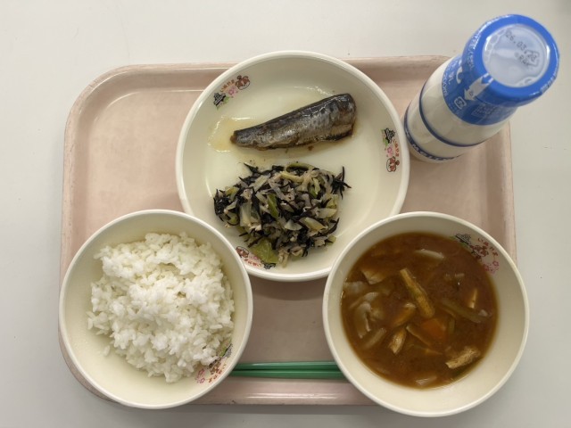 【今日の献立】・ごはん ・牛乳 ・いわしの生姜煮 ・乾物サラダ ・豚汁