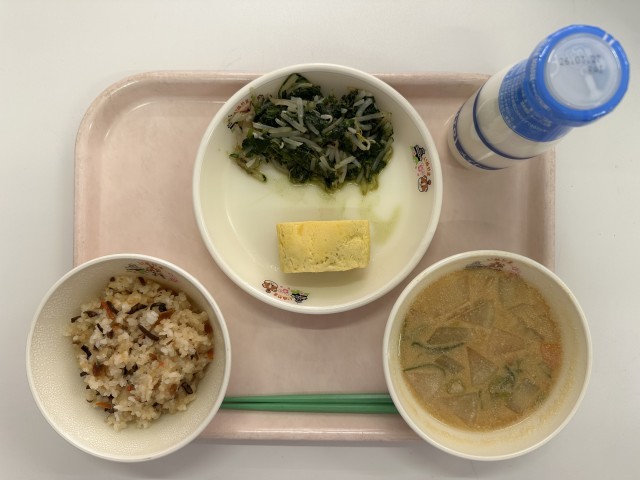 【今日の献立】・山菜ときのこのごはん ・牛乳 ・厚焼き玉子 ・ほうれん草ともやしのお浸し ・豆乳みそ汁