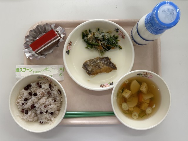 【今日の献立】・赤飯 ・牛乳 ・ホキの揚げ煮 ・野菜のなめたけ和え ・お祝い汁 ・お祝いデザート