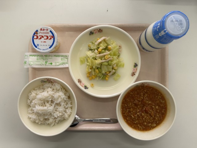 【今日の献立】・麦ごはん ・牛乳 ・キーマカレー ・枝豆サラダ ・ヨーグルト