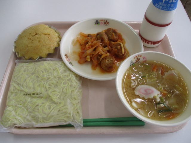 ・味噌ラーメン  ・牛乳  ・肉団子のチリ野菜ソース  ・チーズ蒸しパン