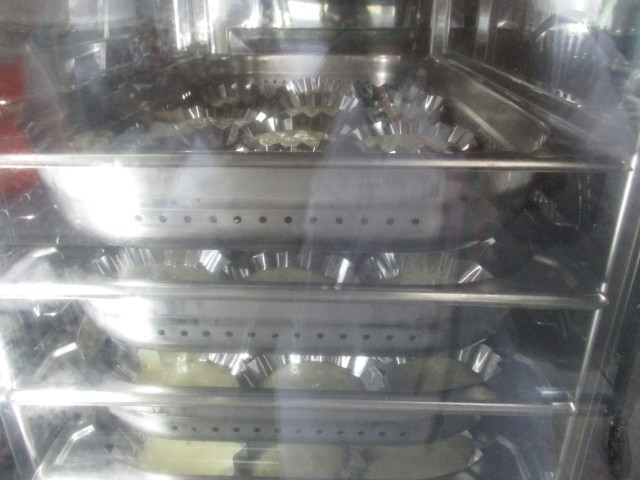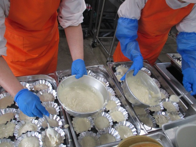 今日の給食に出ている「チーズ蒸しパン」は、写真のように調理員さんが1つずつ手作りをしてくれています。
