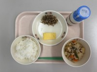 【今日の献立】・ごはん ・牛乳 ・豚肉と大根の煮物 ・厚焼きたまご ・豆...