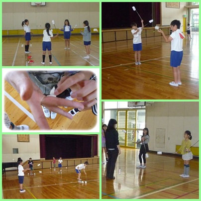 体育館ではトワリング隊が放課を使って特訓中です。トワリングの棒を巧みに操って、華麗な演技を披露するため、毎日練習に励んでいます。練習しすぎて、指の皮がめくれてしまっています。ばんそうこうをはったり、テーピングテープを巻いたりしながら頑張っています。