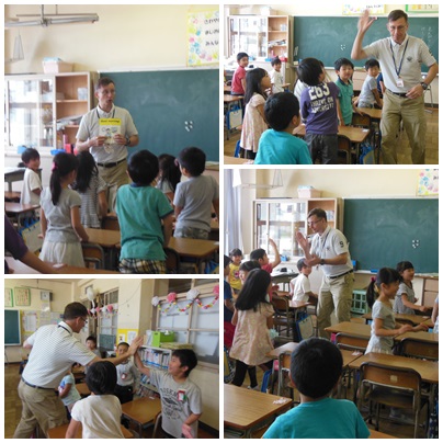 NETの先生との英語の授業です。簡単なあいさつの仕方を楽しいジェスチャーを交えて教えていただきました。子ども達はやりたいという気持ちがあふれています。元気な声で先生や友達と英語であいさつしながらハイタッチをして回ります。その後は、クイズをしながら、NETの先生の自己紹介へと続きました。1年生は年間6回ほどですが、毎回授業を楽しみにしてくれると思います。