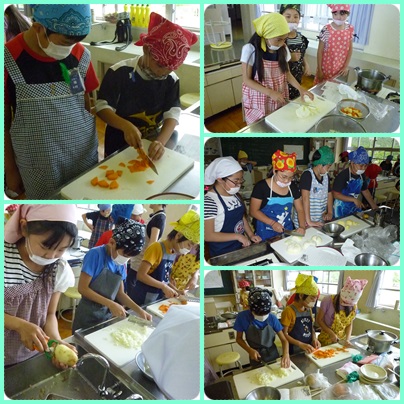 5年3組でも、家庭科で調理実習を行いました。野外教室のカレー作りの練習です。包丁さばきはいかがですか。ジャガイモの皮むきはピーラ—を使いますが、指の皮までむかないようにね。ニンジンが固いので、苦労していました。タマネギは、泣きながら刻んでいる人もいましたよ。いつもは食べるだけのカレーも、苦労して作ったので格別おいしかったことでしょう。