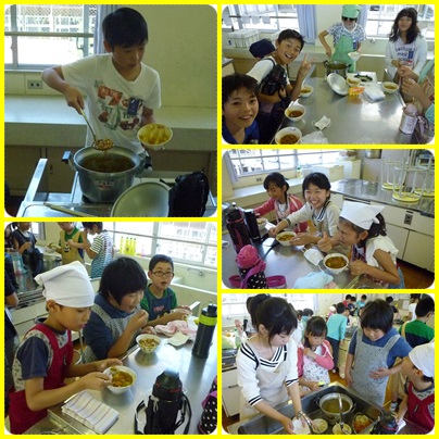 5年生の家庭科では、野外教室に向けて、カレー作りの調理実習をしています。今日は1組がカレー作りに挑戦!おいしそうな香りが漂ってきました。はじめて包丁を使う人もいたようです。ちょっぴり水が多かったかな?煮込み方が足りないかな?でも、どの班もおいしく作れたようです。これで本番もばっちりですね。ぜひお家でも練習しておいてくださいね。