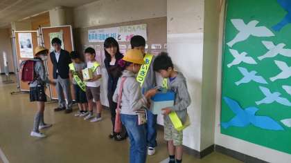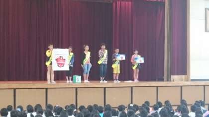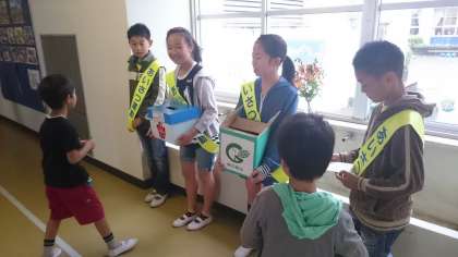 16日の児童集会で運営委員会の6年生から、緑の羽根募金と熊本地震支援募金についてお知らせをしました。すると、17日には大勢の人が募金に参加してくれました。ありがとうございました。募金活動は19日まで続きます。多くの参加をお待ちしています。