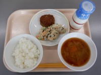 今日の献立は、お赤飯、鶏のから揚げ、野菜のおひたし、すまし汁、おいわいゼリーでした。