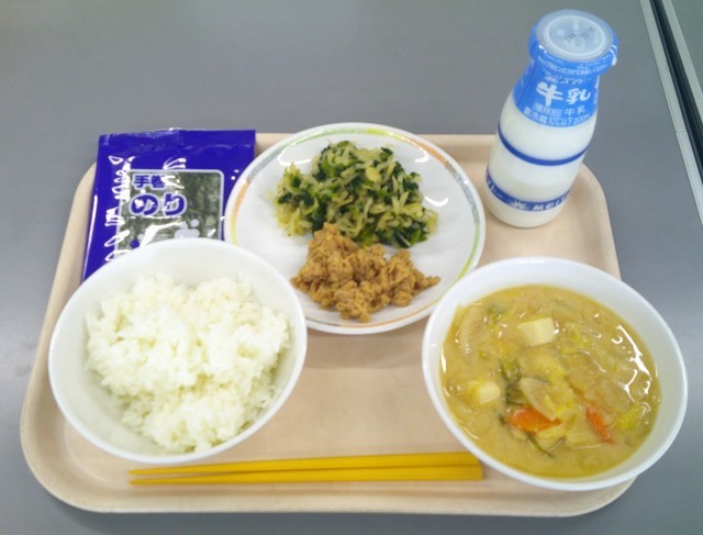 給食週間2日目の今日は、1923(大正12)年に発生した関東大震災後の栄養不足改善としての目標で作られたメニューが、五色ご飯と栄養みそ汁です。