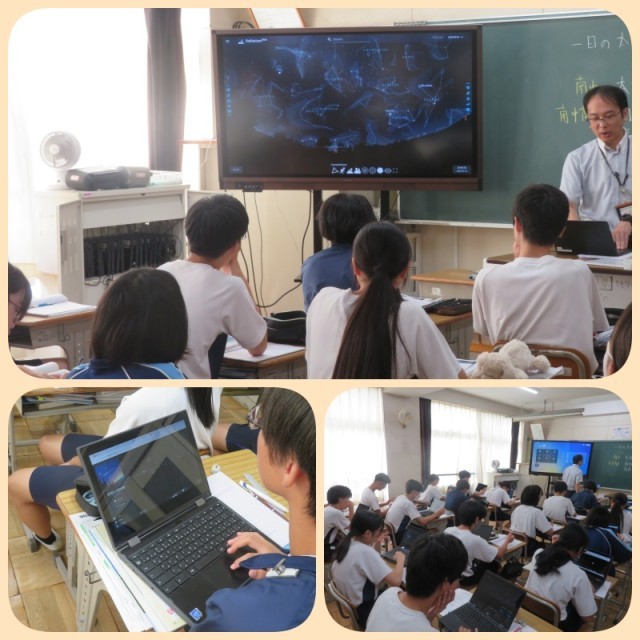 授業の後半では、インターネットのサイトを使って、夜空の星の動きをみんなで観察しました。画面を見てみると、ほとんどの星が動いているかどうか分からない中で、ひときわ速く動く小さな光を見つけました。その正体は、なんと「スターリンク」という人工衛星だそうです。教科書だけでは知ることができない、宇宙の不思議を感じることができました。