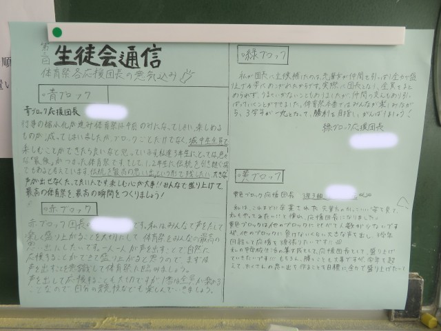 体育祭まで残りわずかとなりました。生徒会からは、全校生徒に向けて「生徒会通信」が発行され、体育祭を牽引する各団長の熱い意気込みが掲載されました。
