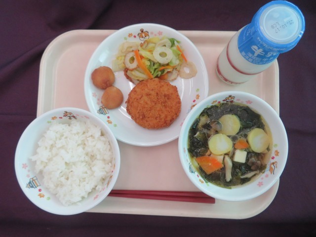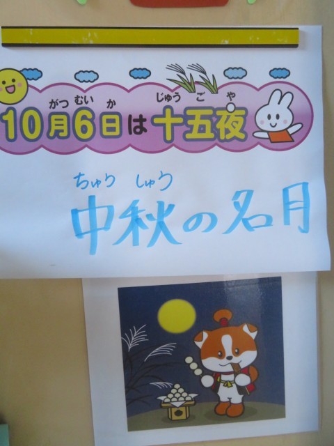 今日の給食は、「中秋の名月 十五夜献立」ご飯 里芋コロッケ 白菜と竹輪の生姜和え お月見汁 お月見きなこ餅 牛乳 です。