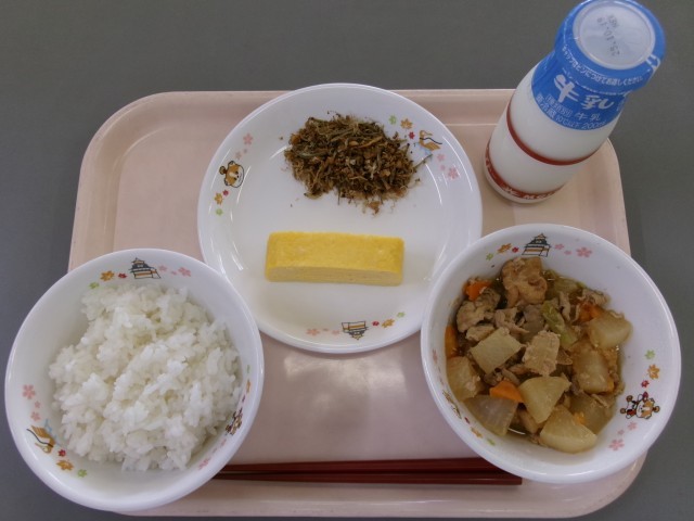 今日の給食は、ごはん 豚肉と大根の煮物 厚焼きたまご 豆じゃこふりかけ 牛乳 です。