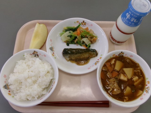 今日の給食は、ごはん いわしの生姜煮 小松菜のなめ茸あえ 豚汁 りんご 牛乳 です。