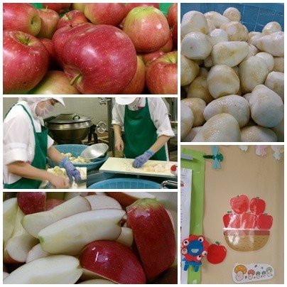 秋の味覚、りんごを出しました。「1日1個のりんごは、医者を遠ざける」という西洋のことわざがあります。りんごは、栄養価が高く、ビタミンや、カリウム、ポリフェノール、腸内環境を整える食物繊維も含まれます。りんごの皮や皮近くには、果肉部分に比べて食物繊維は約1.5倍、ビタミンCも約1.6倍多く含まれます。よく噛んで味わいながらいただきましょう。特に今日のりんごは、シナノスイートという品種。甘みがあり、果汁もたっぷりです。